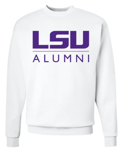 One of our most popular items! This lightweight LSU Alumni Sweatshirt in white, grey and pink is the perfect outerwear piece for all seasons. 50% Cotton, 50% Polyester, fleece-lined. Fit is true to size. Order a size up if you prefer an over-sized fit.