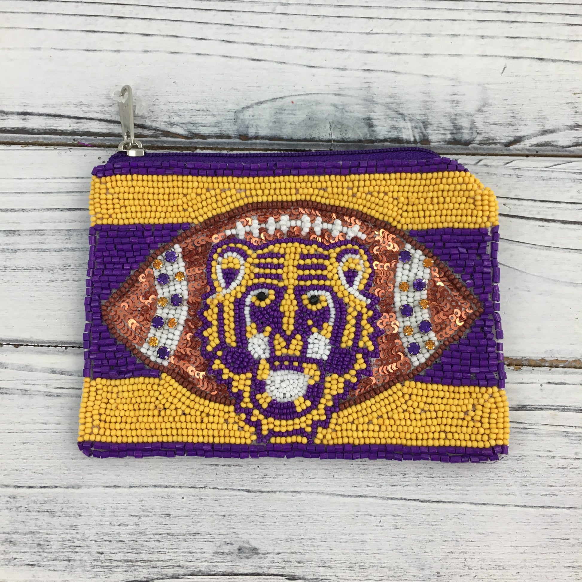 This is our ferocious Tiger coin purse! It is intricately beaded and has a Tiger head and a football on it! This is perfect for game days and keeping your clear purse looking fresh!