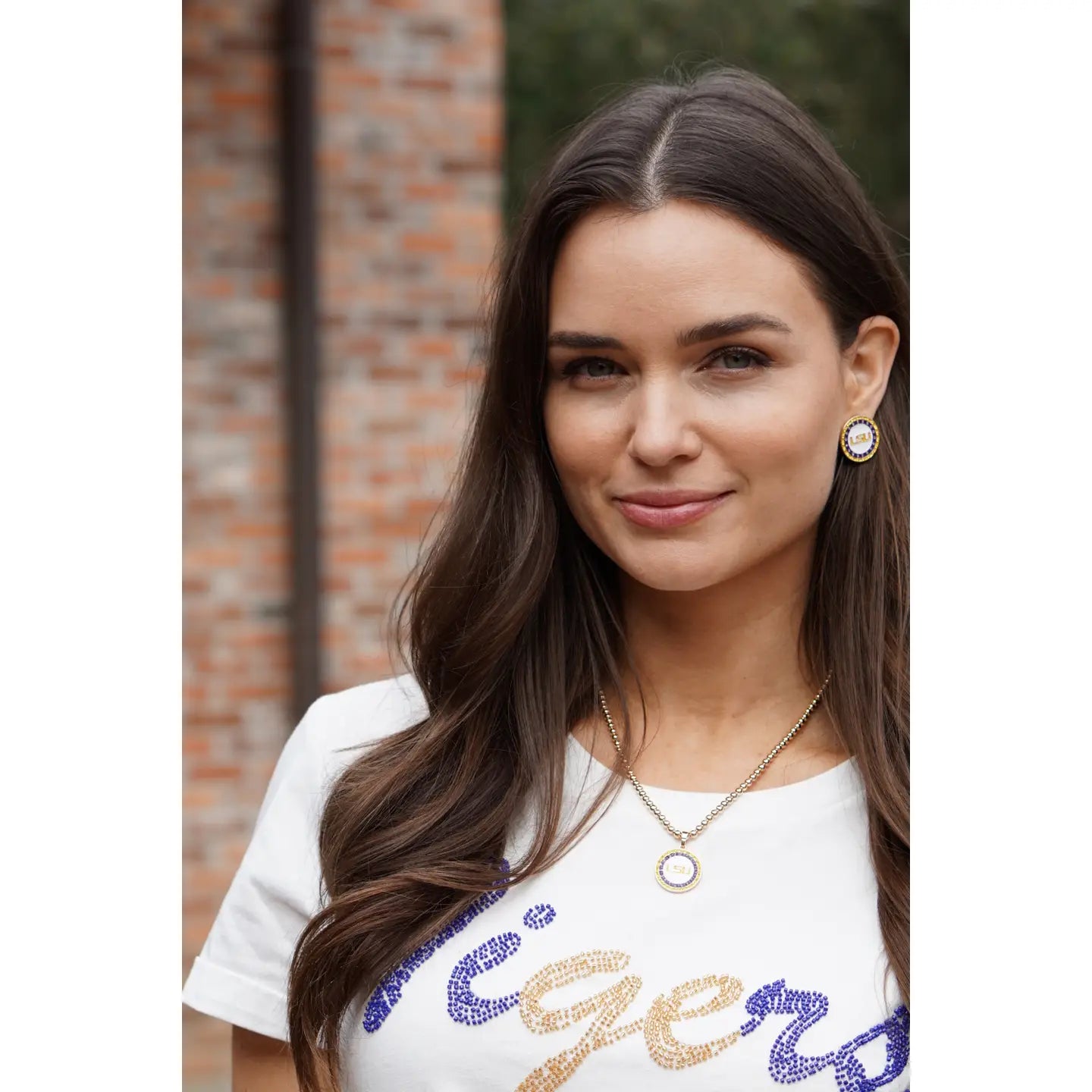 The LSU Tigers Pave Disc Stud Earrings in Purple/Gold/White combine team colors and a bit of sparkle. Featuring the LSU logo on a pave disc in purple, gold, and white, these earrings are a stylish and chic way to show off your school spirit.