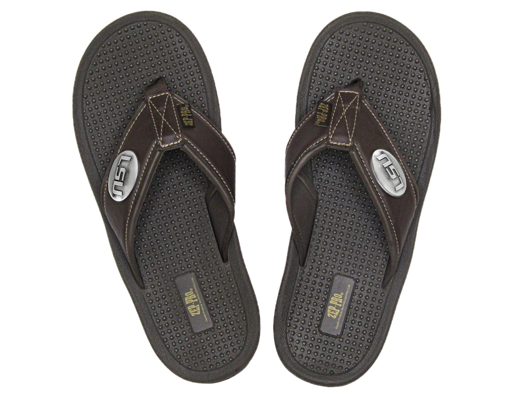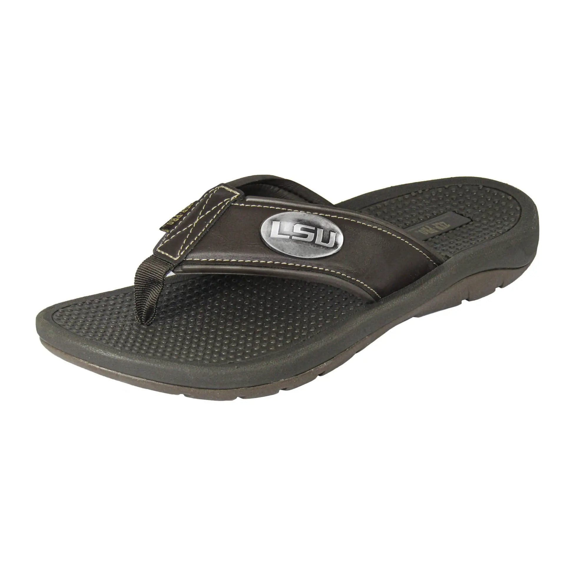 Show your LSU Tigers pride with an original Zep-Pro collegiate brown flip flop sandal. These flip flops are comfortable allowing natural movement and breathability. The cushioned sole provides a soft landing for each step, reducing the impact on the feet and joints, while the flexible contour supports the natural arch of the foot, enhancing comfort during prolonged wear. The non-skid outsole is great for boating or deck use. Decorated with an official collegiate logo, the straps are designed with a cushioned synthetic liner, ensuring a snug fit. This open design keeps feet cool and dry, providing an ideal choice for warm weather and casual outings. These flips flops are popular among college fans, students, and alumni. It is a stylish and unique way to show enthusiasm while walking around town, running errands and backyard family outings. A perfect fan gift for Father's Day, birthday, graduation or a special occasion. Zep-Pro flip-flop is a must-have for any college sports fan.